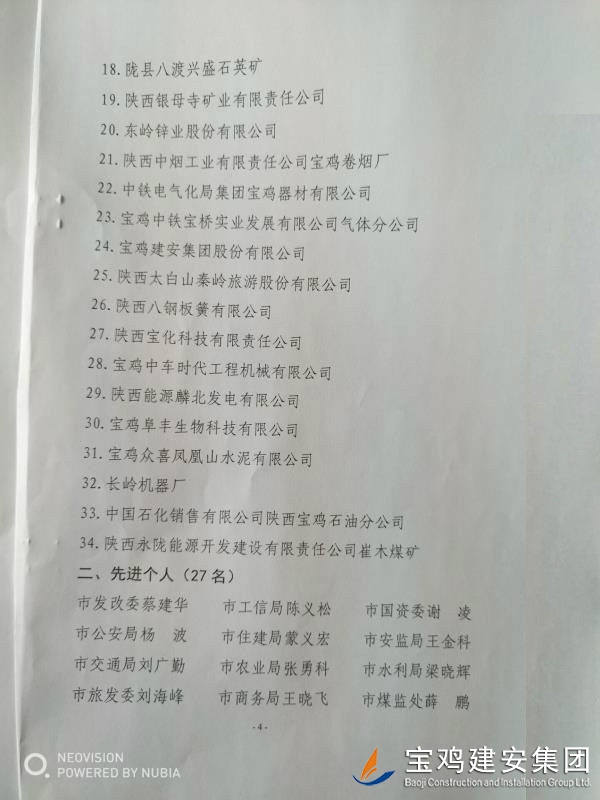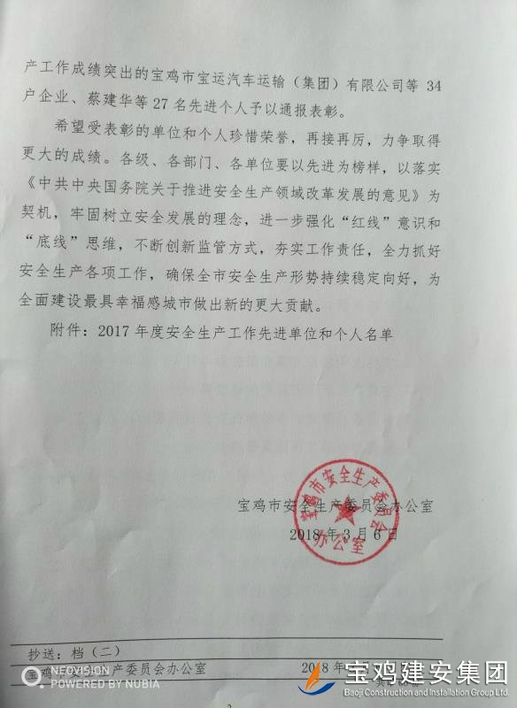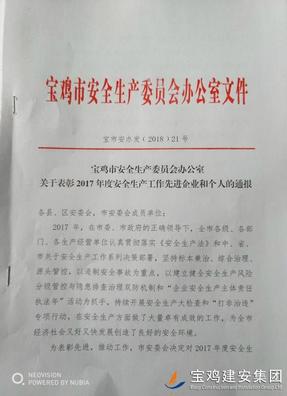 近期,寶雞市安委會對2017年度安全生產(chǎn)先進單位進行了通報,我單位在考核中以優(yōu)異的成績獲得了此項殊榮。當(dāng)然,取得這樣的成績,離不開各級領(lǐng)導(dǎo)的正確決策和基層單位的艱辛付出,公司安委會在此表示感謝。 2017年,公司始終圍繞在國家的大政方針框架下,積極展開以《安全生產(chǎn)法》及相關(guān)規(guī)范標準為核心的安全工作,堅持標本兼治、綜合治理、源頭管控,以遏制安全事故為重點,建立健全安全生產(chǎn)風(fēng)險分級管控與隱患排查治理雙重機制,持續(xù)開展安全生產(chǎn)專項檢查,杜絕了惡性事故的發(fā)生。在安全生產(chǎn)標準化建設(shè)中,公司始終以“科技創(chuàng)新、合理投入、擇善而從”為出發(fā)點進行部署管理,通過系統(tǒng)管理及一系列舉措,使公司安全管理走在本土行業(yè)前列,且在多次檢查驗收中,獲得省、市級領(lǐng)導(dǎo)的點贊。 九牛一毫莫自夸 驕傲自滿必翻車,成績只代表過去,2018年,我們要完善不足,戒驕戒躁,砥礪前行。 寶雞建安集團股份有限公司安委會 2018年4月25日