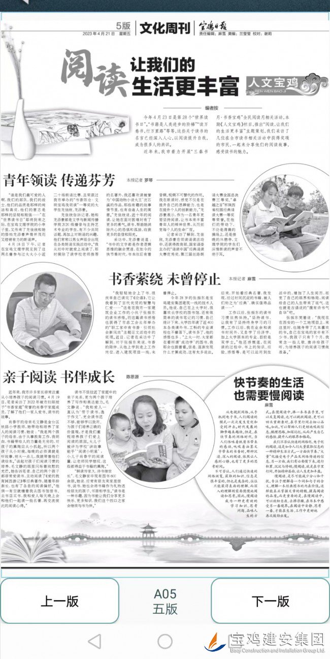 編者按:在第28個(gè)世界讀書(shū)日到來(lái)之際,《寶雞日?qǐng)?bào)》社策劃了讀書(shū)專版,鑒于寶雞建安集團(tuán)工會(huì)長(zhǎng)期堅(jiān)持舉辦的“書(shū)香企業(yè)”征文活動(dòng)在社會(huì)的影響力與美譽(yù)度,記者來(lái)電提出采訪意向,公司工會(huì)極力舉薦了來(lái)自基層一線熱愛(ài)閱讀并多次參與讀書(shū)征文的技術(shù)人員張振東同志。5月21日,《寶雞日?qǐng)?bào)》發(fā)表了這篇小專訪,現(xiàn)予轉(zhuǎn)發(fā)。